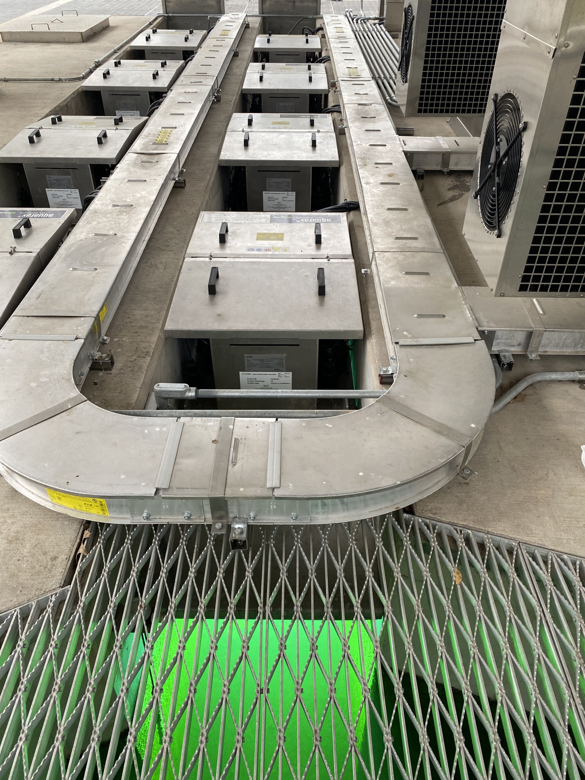 - A view from the effluent channel walkway showing the glowing UV Disinfection system.