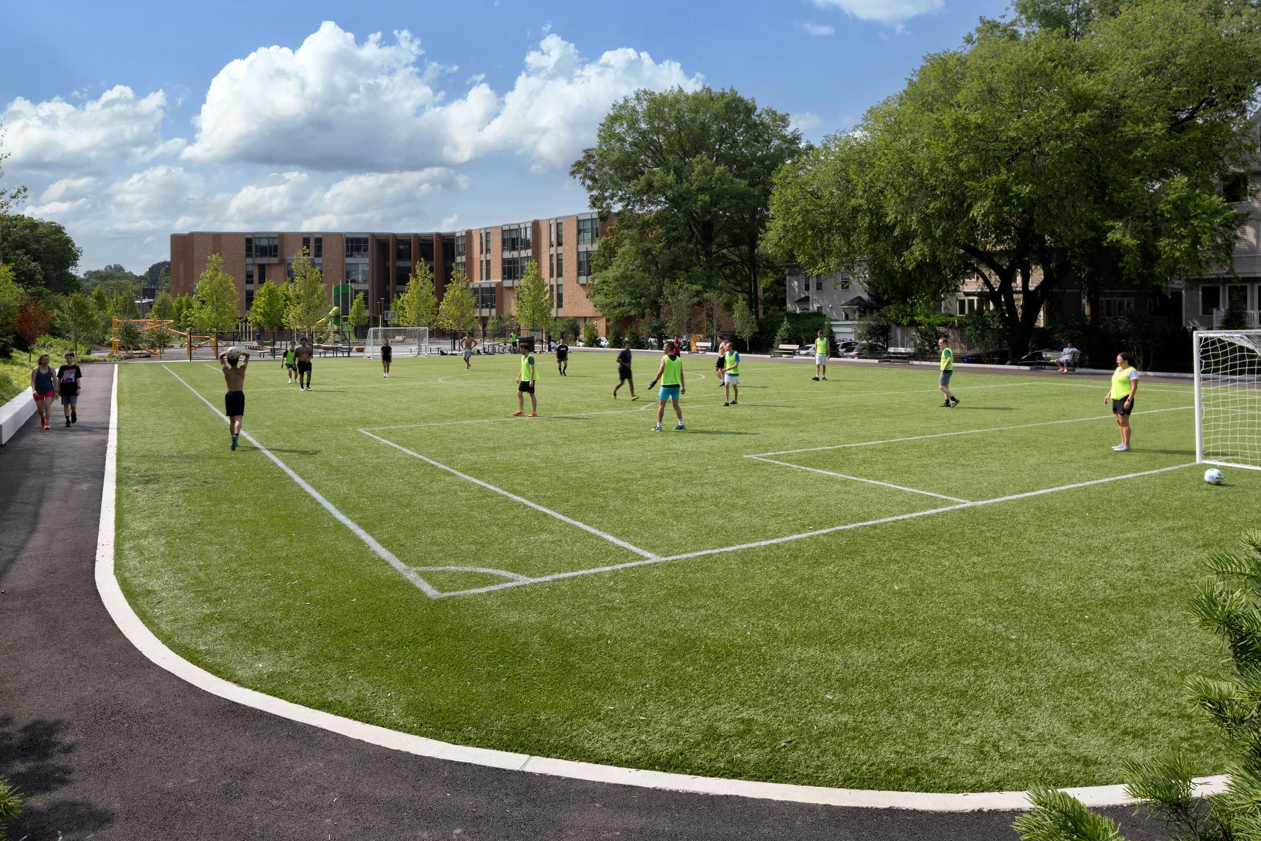 Our landscape architects has designed a variety of outdoor spaces for the school, including courtyards, play areas, and sports fields. The new site layout creates an abundance of usable open space and features four play areas, a synthetic turf soccer field, basketball court, and picnic areas.