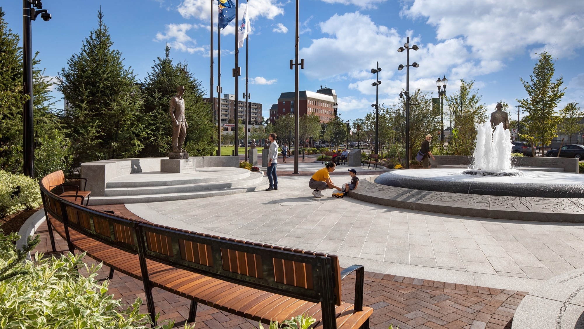 “Generals Park is located in a downtown area of Quincy, experiencing major economic growth and redevelopment. The park features bronze likenesses of seven U.S. military generals and a dynamic water feature. One of the interesting details of the fountain is the engraved laurel leaf motif along the coping, symbolizing honor and achievement.”