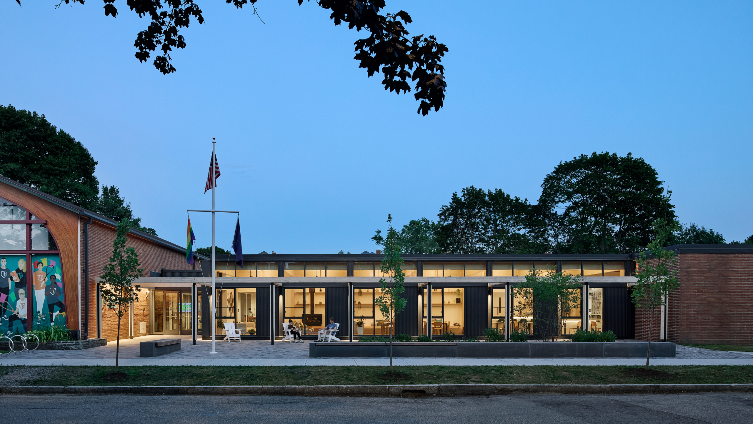 The outdoor areas include a new patio and a multi-sport court which can be used for basketball or pickleball. The outdoor space functions as an extension of the interior program, and the flexible court and patio spaces were designed to enhance the facility’s after-school programming and social events. A redesigned entrance includes improved streetscape elements and a community front porch, a visible gesture of the center’s accessibility to the neighborhood. Green infrastructure elements include rain gardens and new plantings to assist with stormwater collection and management.