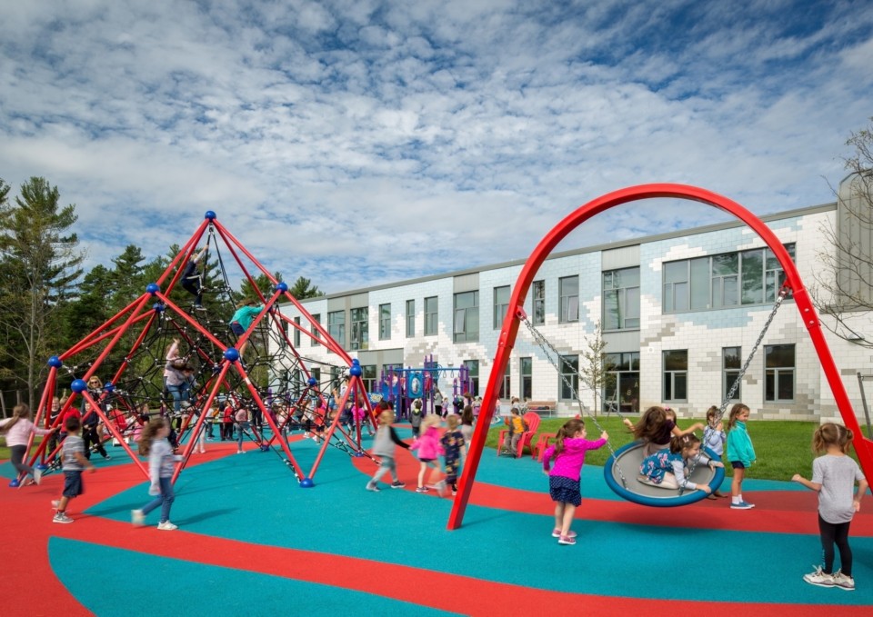 Inspired by local cranberry bogs, the design’s curvilinear form, color, and materials visually and physically connect the open space to the larger landscape. Circular planting beds and paving patterns at the front plaza create a welcoming and dynamic gateway to the school. Behind the building, the site features a series of outdoor rooms with landforms, natural materials, native plants, and inclusive play equipment designed to expand and enhance opportunities for childhood development. The flexible courtyard and various types of seating blur the boundary between indoor and outdoor learning spaces.