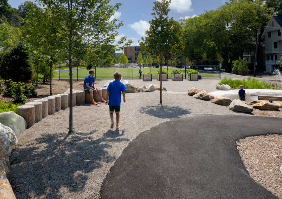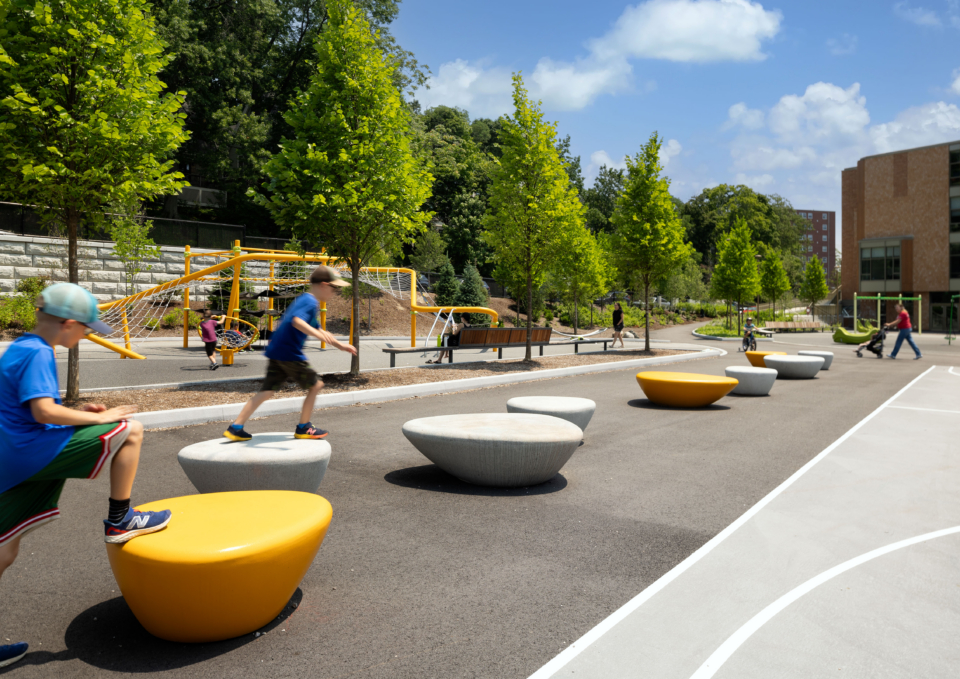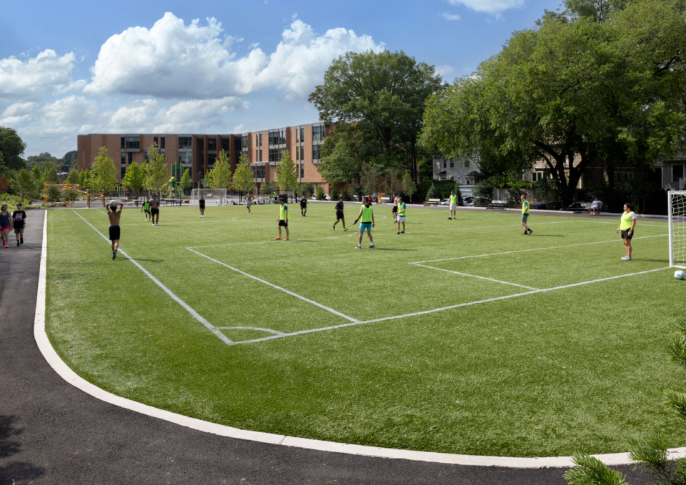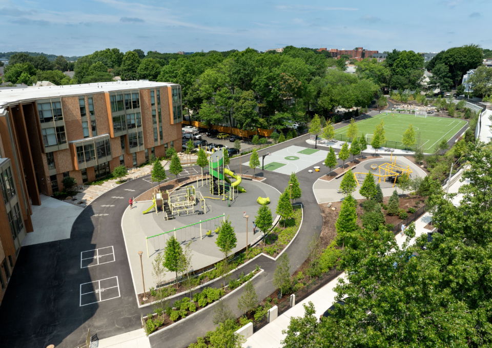 Our landscape architects designed a variety of outdoor spaces for the school, including courtyards, play areas, and sports fields. The new site layout creates an abundance of usable open space and features four play areas, a synthetic turf soccer field, basketball court, and picnic areas.