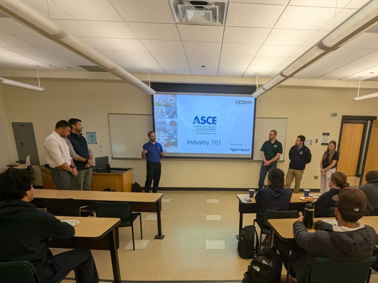 Thomas Wamser, PE joined other members of the ASCE CSCE Younger Member Group to lead an “Industry 101” presentation to the ASCE UConn Student Chapter, where he highlighted real world obstacles civil engineers may encounter on the job and shared potential career paths in various sectors of civil engineering.