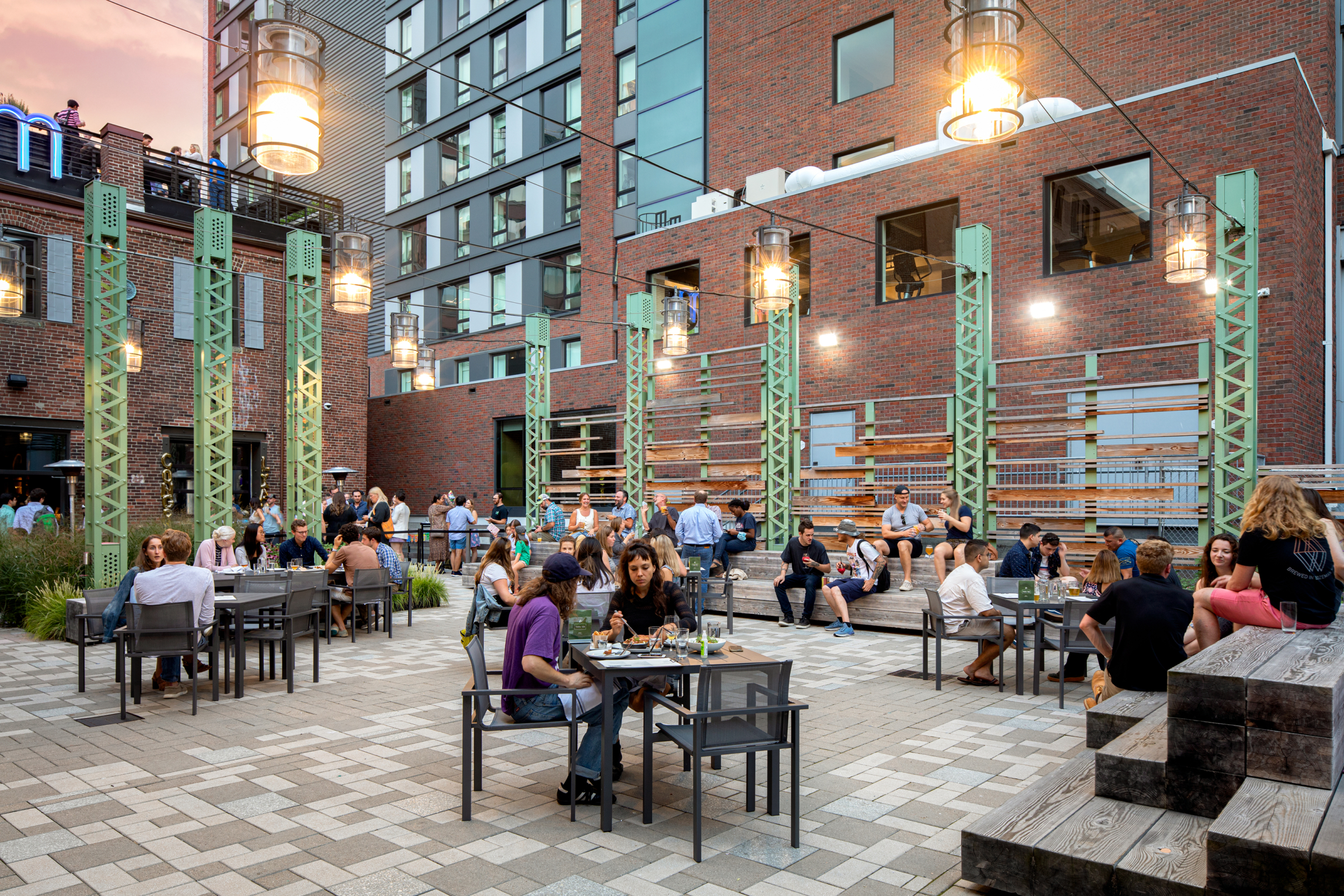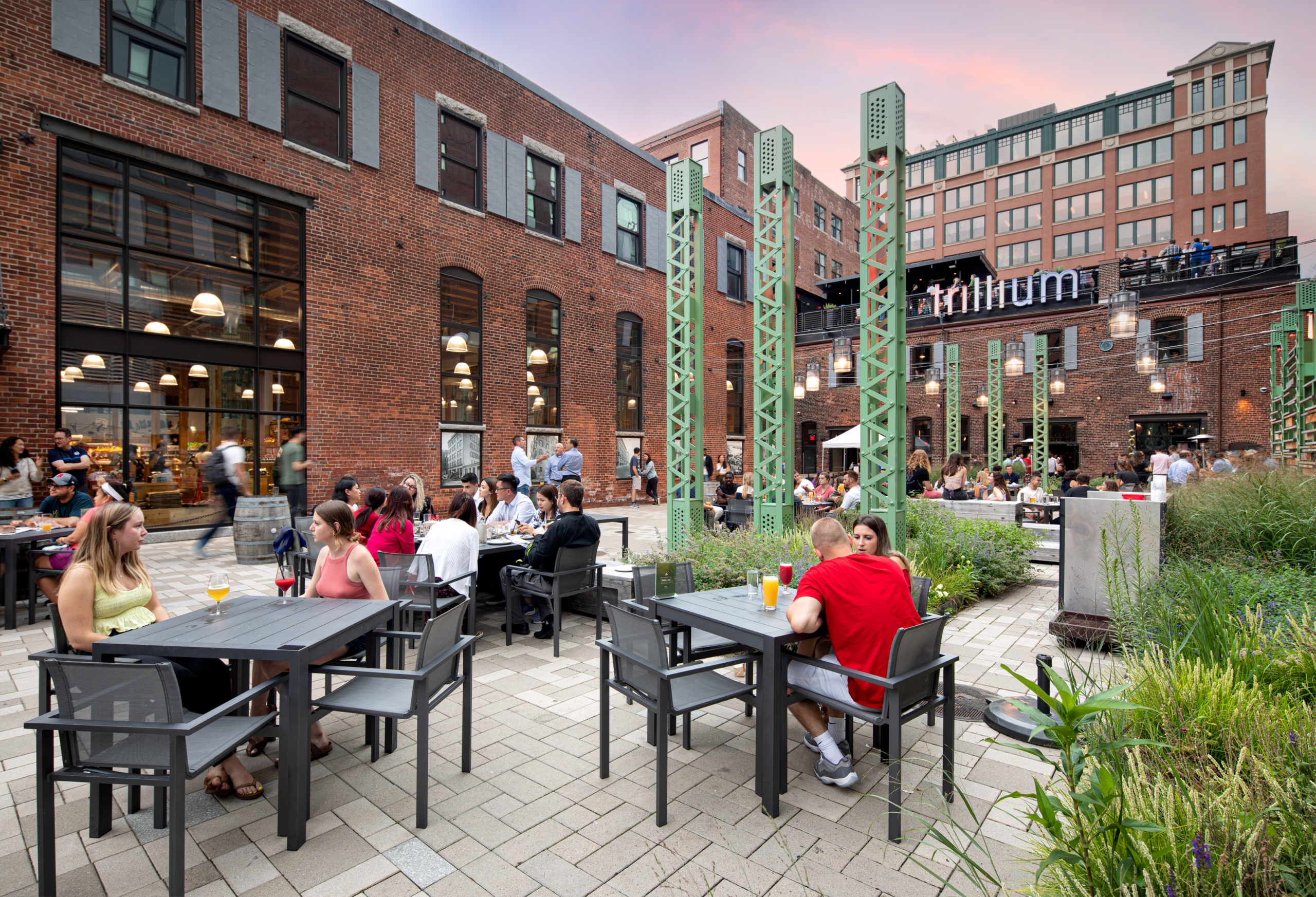 Thomson Place is a mixed-use development in Boston’s Fort Point neighborhood, which involved the redevelopment and adaptive reuse of several mid-1800s industrial buildings. The plaza is a key feature in the development, serving as a community center and gathering place for residents and shoppers at nearby businesses.