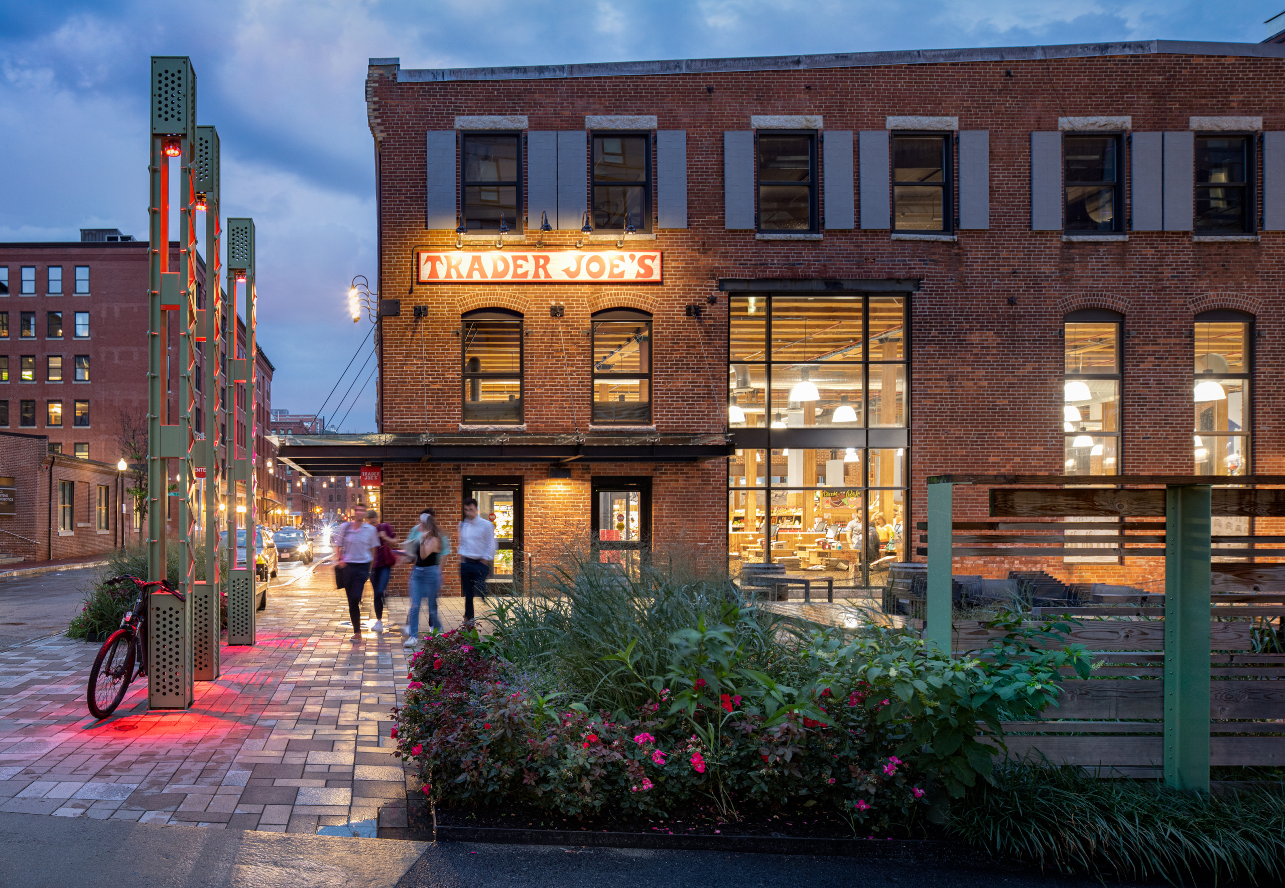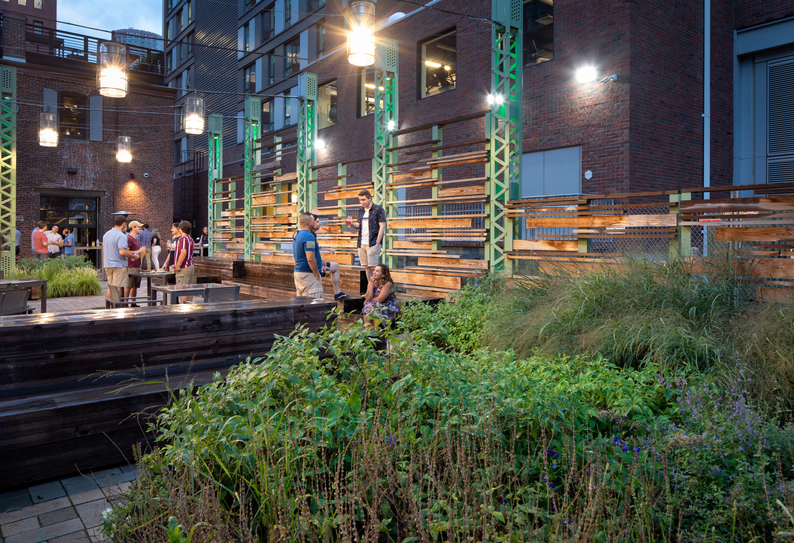 The plaza incorporates several elements that recall Fort Point’s history as an industrial hub and rail yard. Metal stanchions, used to hold up the lighting elements of the plaza, derive their form from the historic Northern Avenue Bridge structure. Precast concrete unit pavers recall the design of the rails that used to carry freight through Fort Point’s narrow alleyways. Seating elements are inspired by the wooden pallets that were once an omnipresent sight in Boston rail yards.