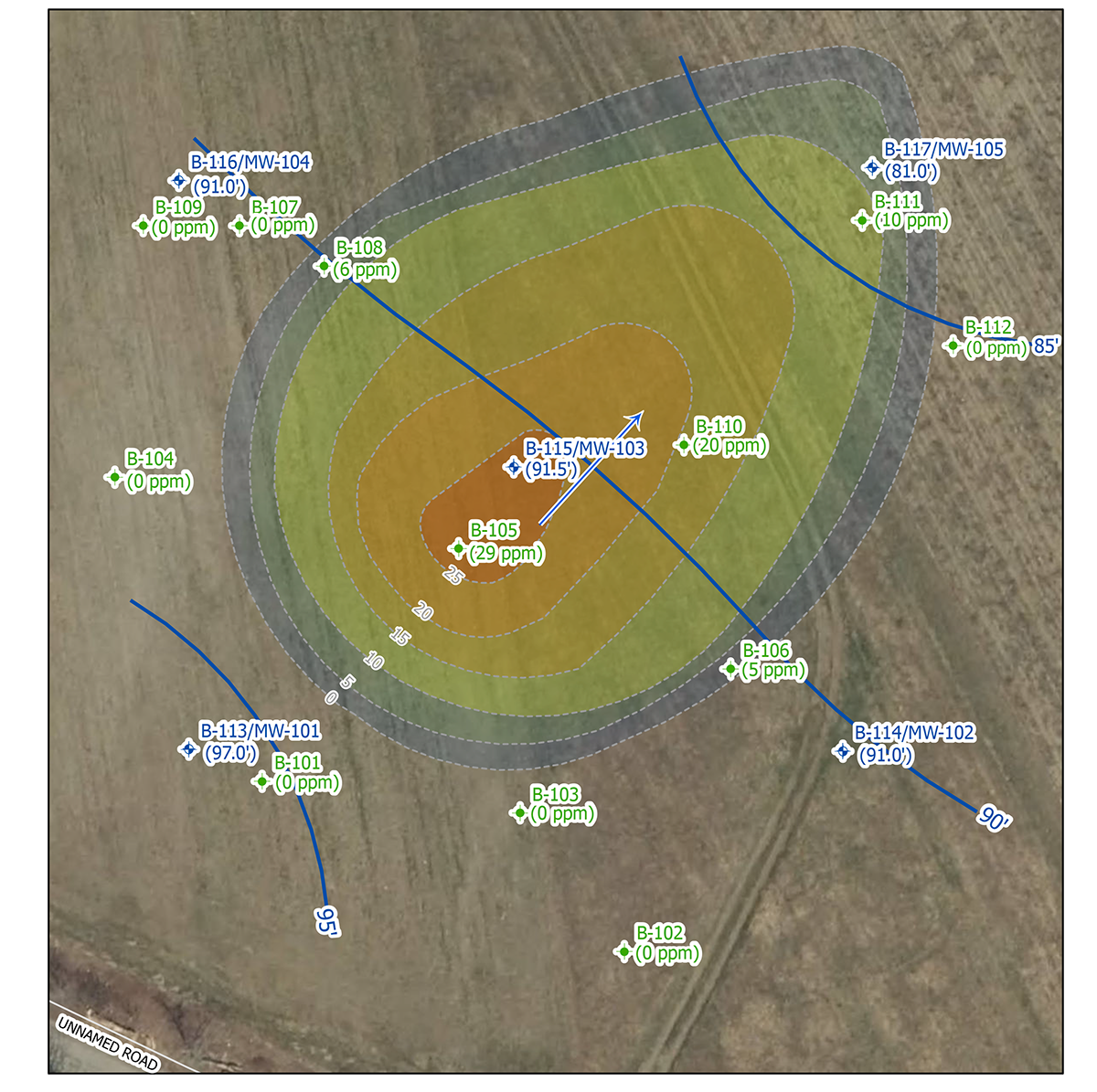 This graphic shows fan example contamination plume that summarizes a large data set into an easy to understand visualization. This graphic was created for demonstration and does not represent an actual site.