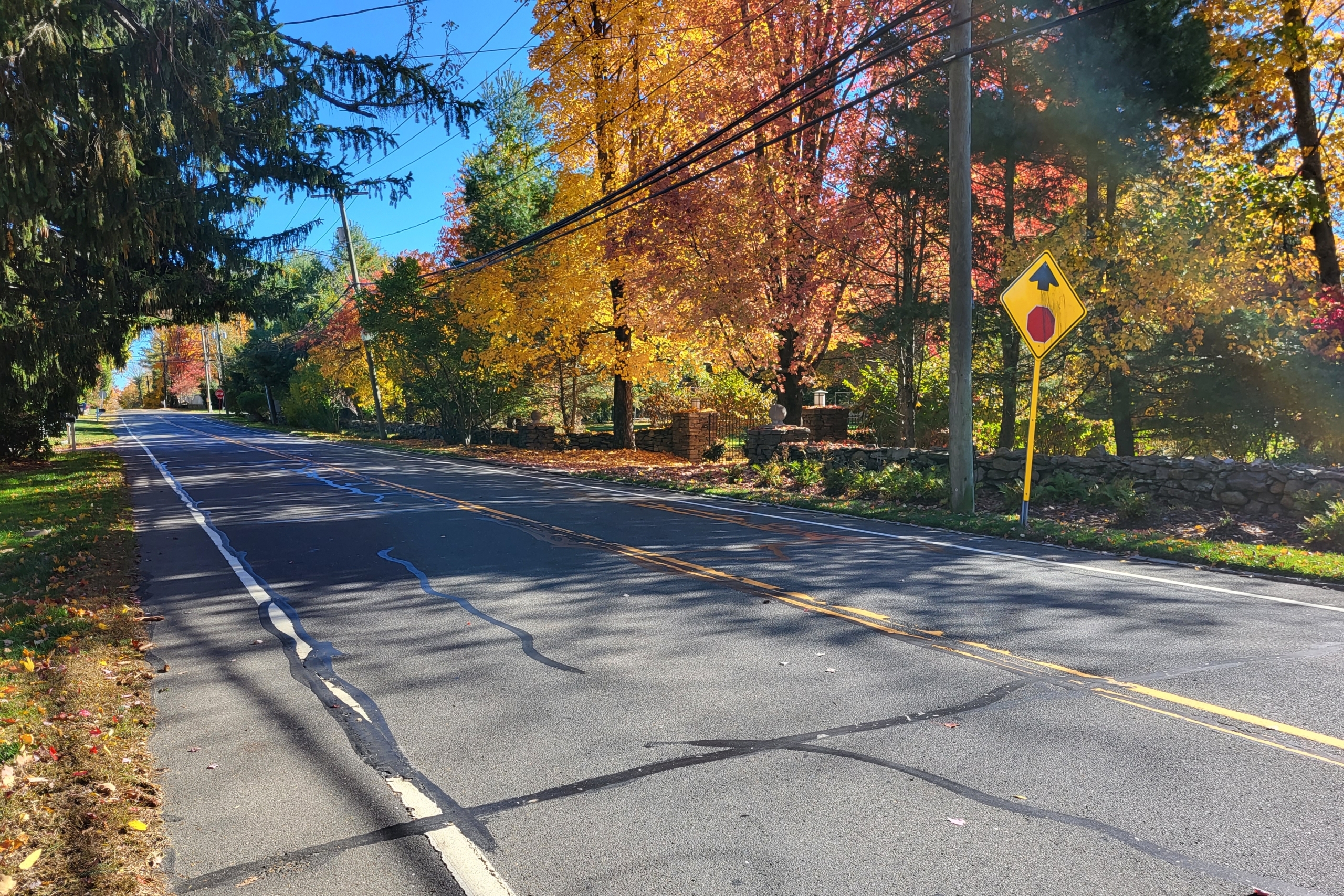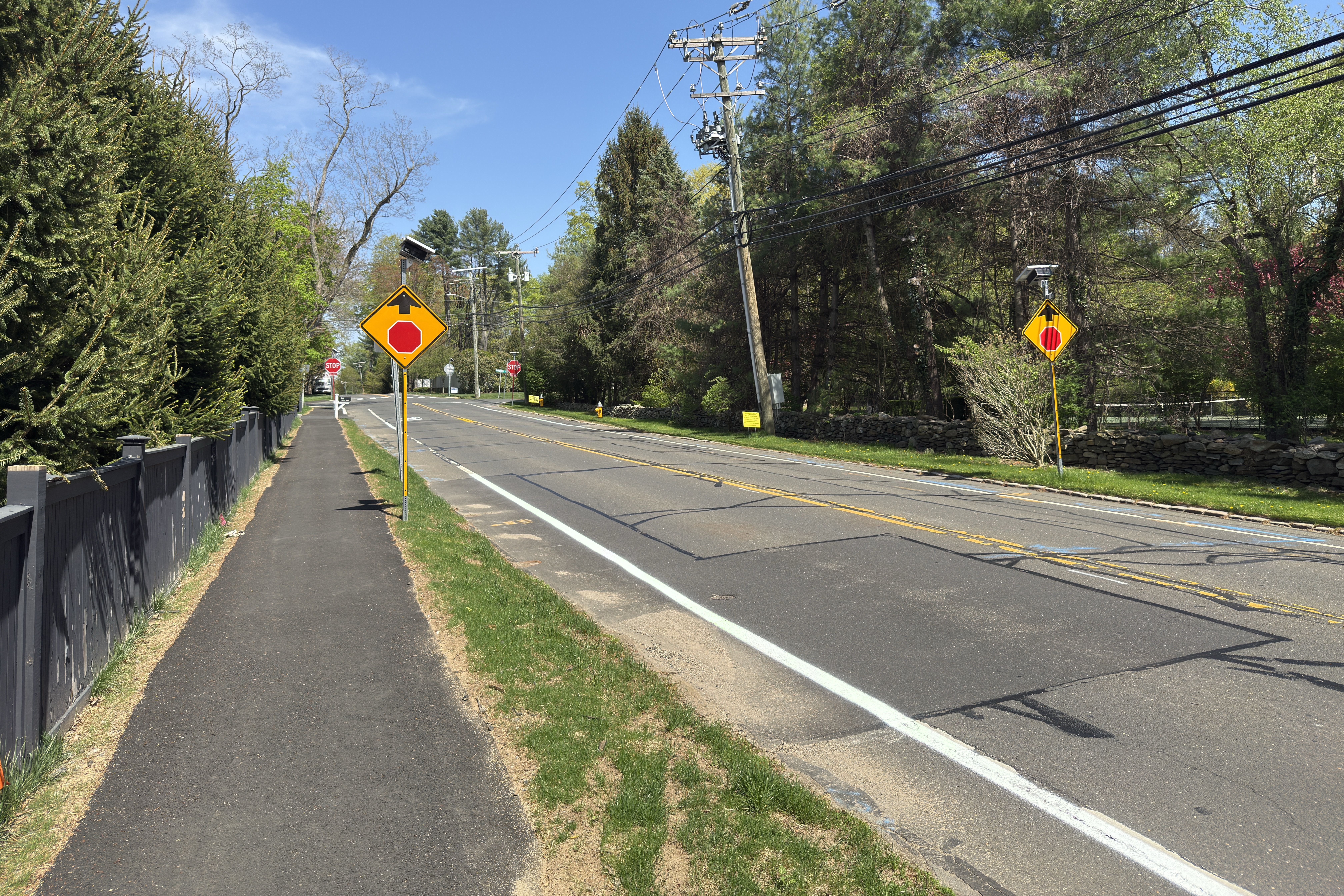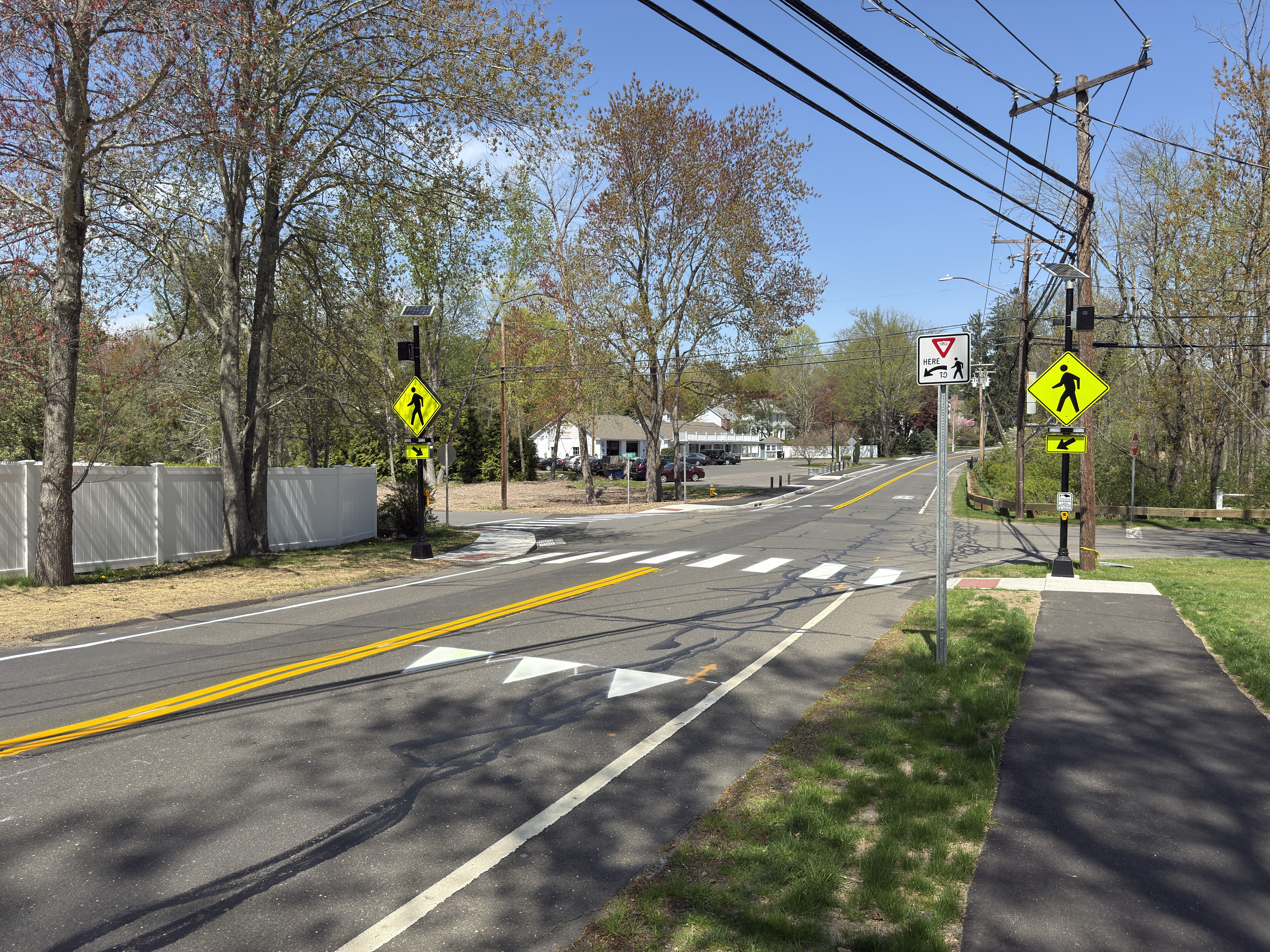 Phase one of this multi-phased improvement project focused on addressing critical safety concerns through traffic engineering and intersection redesign at the Cross Highway intersections with North Avenue and Bayberry Lane. Key upgrades to the intersections include illuminated, radar-actuated signage; enhanced pedestrian crossings with warning systems; and a Rectangular Rapid Flashing Beacon (RRFB) to improve visibility and driver yield rates. Continuous sidewalks were also added along the eastern portions of the corridor connecting Town facilities to residential areas to support safer pedestrian mobility.